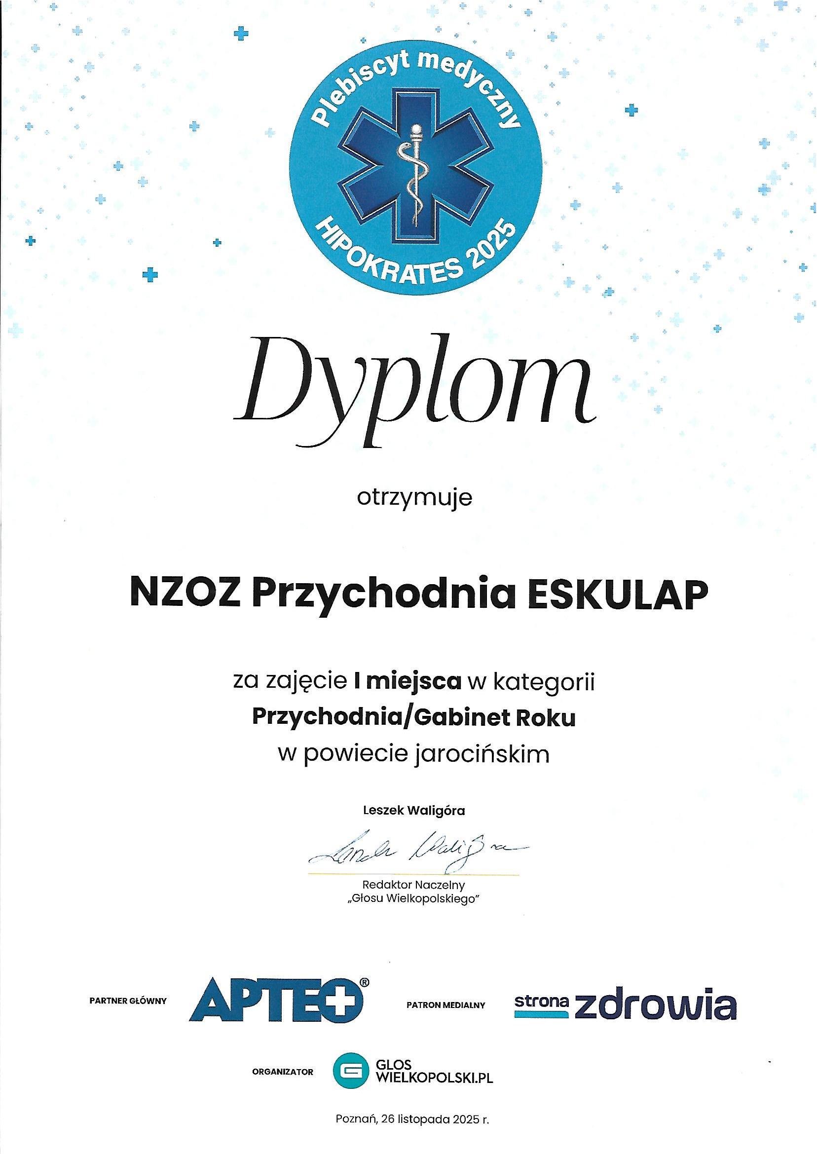 1. Przychodnia/Gabinet Roku – NZOZ Przychodnia ESKULAP – I miejsce