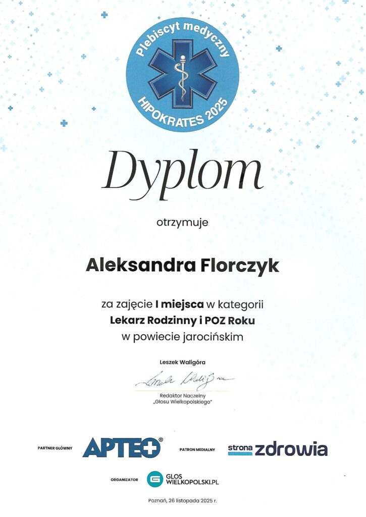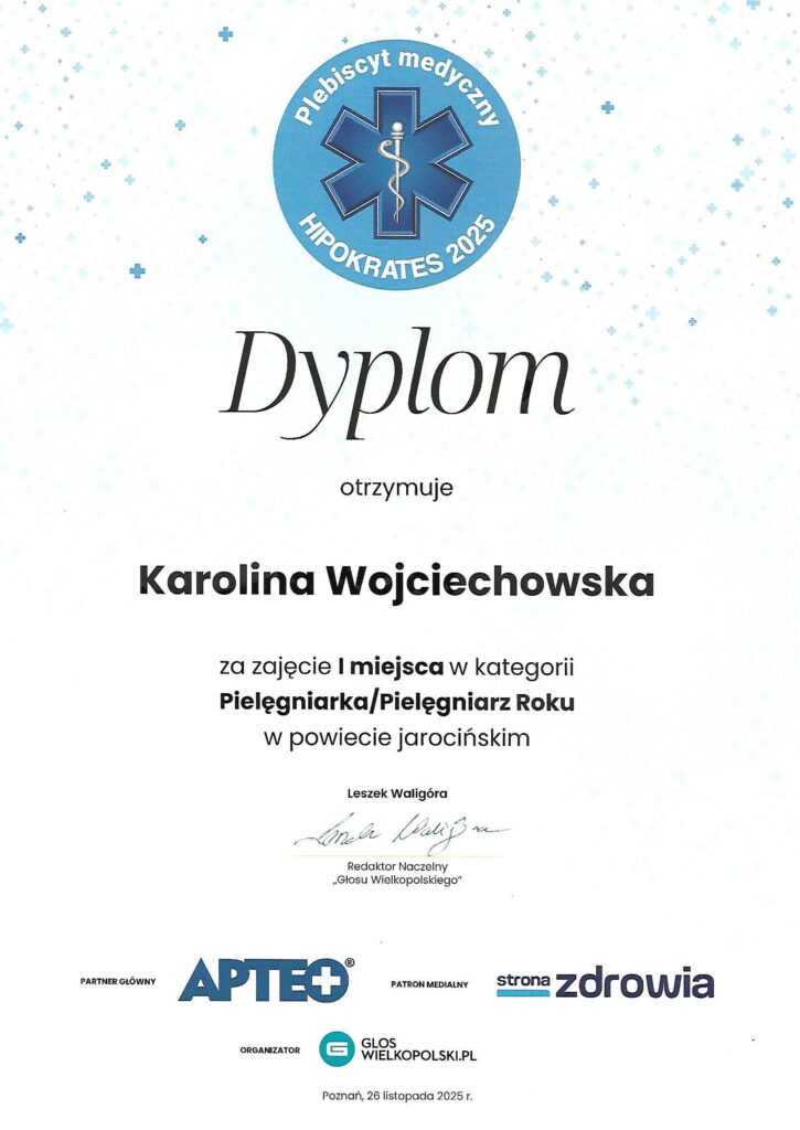 ”Głos Wielkopolski” 26 listopada 2025 roku podczas uroczystej gali plebiscytu „HIPOKRATES 2025” uhonorował pracowników ochrony zdrowia, którzy cieszą się największym uznaniem i sympatią. Kandydatów do nagród nominowali Ci, którzy najlepiej znają medyków – pacjenci. Nagrodę dla śp. Iwony Ulatowskiej odebrał jej syn Jakub.